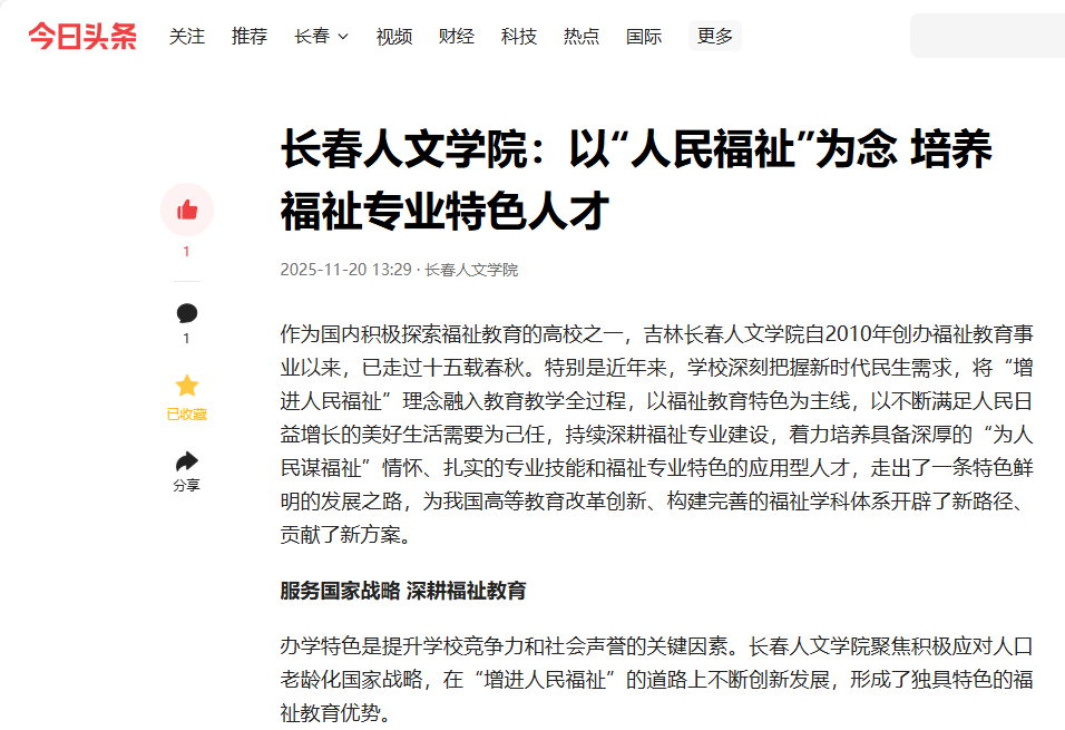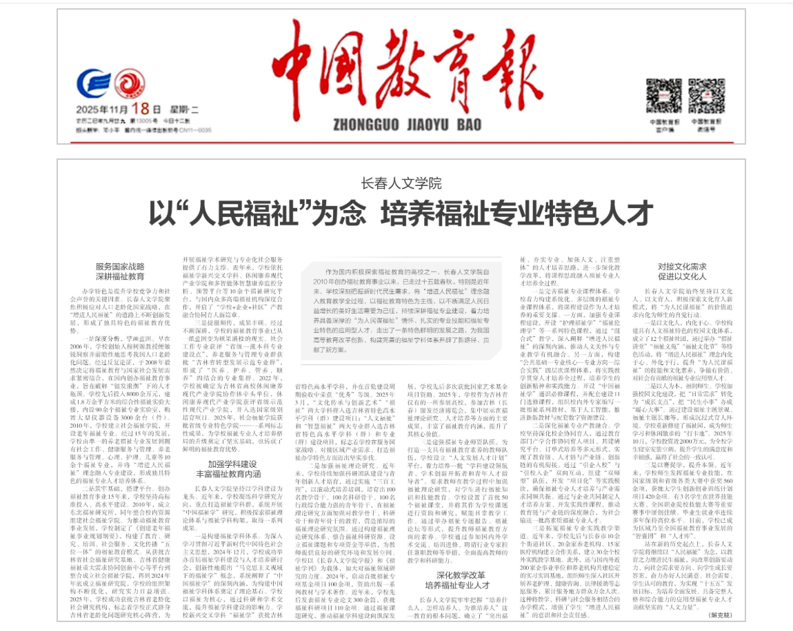 11月18日,《中国教育报》以长春人文学院以“人民福祉”为念,培养福祉专业特色人才为主题,全面报道学校创办福祉教育15年来,培养福祉专业特色人才成效,引起各大媒体网站的关注。