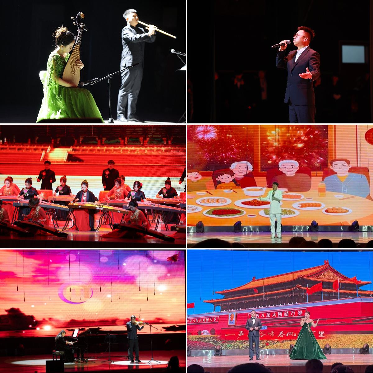 民乐重奏《春江花月夜》、歌曲《寸心》、小提琴独奏《丰收渔歌》接连上演,展现多元艺术风貌。古筝合奏《盛世国乐》、重唱《春风十万里》及《欢聚一堂》等节目,进一步营造出热烈昂扬的现场氛围。