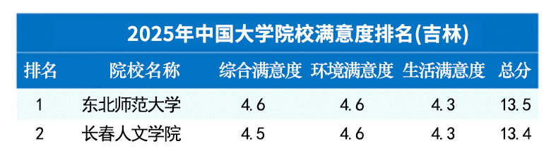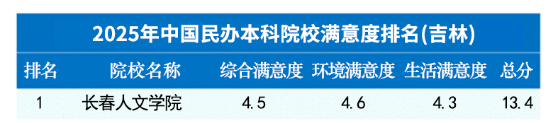 10.社会满意度实现新跃升。学校在中国高等教育学生信息网“阳光高考”信息平台2025年度中国民办本科院校满意度排名(吉林)中位列第一,在中国大学院校满意度排名(吉林)中位列第二,彰显了综合满意度、环境满意度、生活满意度三大指标全面领先,办学美誉度与社会影响力实现全面跃升。
