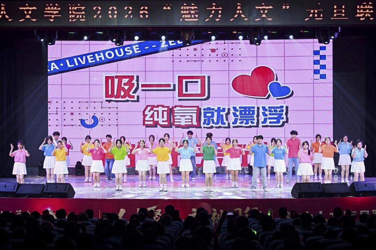 第三篇章“人文・致远”描绘学校发展蓝图,奔赴崭新征程。文学院学生的朗诵《文心映山河,青春赴新程》,以铿锵节奏抒发家国情怀,传递着以青春之我续写时代华章的坚定信念;美术与设计学院的《桃花朵朵开》则化春意为舞姿,师生们如朵朵初绽新桃,勾勒出一片春意盎然的美景,述说对新年的美好期盼。音乐舞蹈学院音乐系教师陈伟、学生樊思瑶同台演唱歌曲《载歌载舞》,嘹亮的高音搭配激昂奋进的旋律,将对生活的热忱、对未来的憧憬融入每一个音符。儿童福祉学院师生的舞蹈《驰舞芳华》,用活力四射的舞蹈唤醒时光里的经典记忆,让岁月沉淀的热忱与当代青春活力碰撞出别样光彩。随着《相亲相爱》的温馨旋律响起,全场洋溢着喜悦与感动,这正是“共绘人文画卷、同谱福祉新篇”的生动写照,凝聚起人文师生携手前行的奋进力量,为联欢会画上圆满句号。