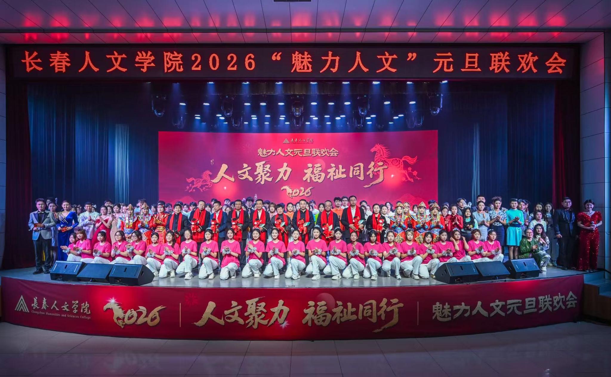 “人文聚力,福祉同行”。12月31日下午,学校图书馆报告厅座无虚席,一派祥和喜庆的节日氛围。2026“魅力人文”元旦联欢会在这里激情上演。董事长穆华英、校长张兴海、党委书记柳轶、顾问兼监事会主席吕英华等校领导,以及机关、基层单位负责人、全体教师、辅导员和学生代表欢聚一堂,共赴一场兼具人文底蕴与青春活力的文化盛宴,共同迎接充满希望与憧憬的2026年元旦佳节的到来。