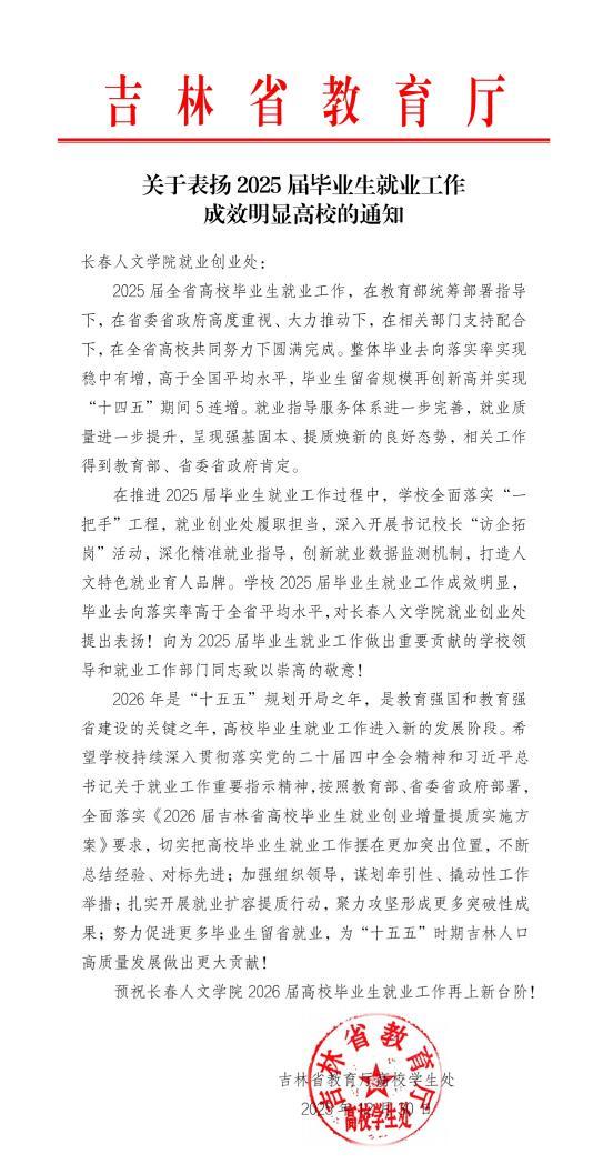 12月30日,吉林省教育厅发布《关于表扬2025届毕业生就业工作成效明显高校的通知》,对我校毕业生就业工作给予充分肯定。通知指出:“学校2025届毕业生就业工作成效明显,毕业去向落实率高于全省平均水平,对长春人文学院提出表扬!”